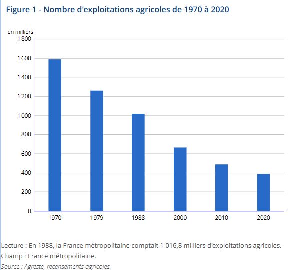 Toutefois, le graphique ci-dessous (source Insee) démontre clairement que la diminution des exploitations n’a cessé de continuer et s’est même accélérée : on constate ainsi une division par quatre entre 1970 et aujourd’hui !
